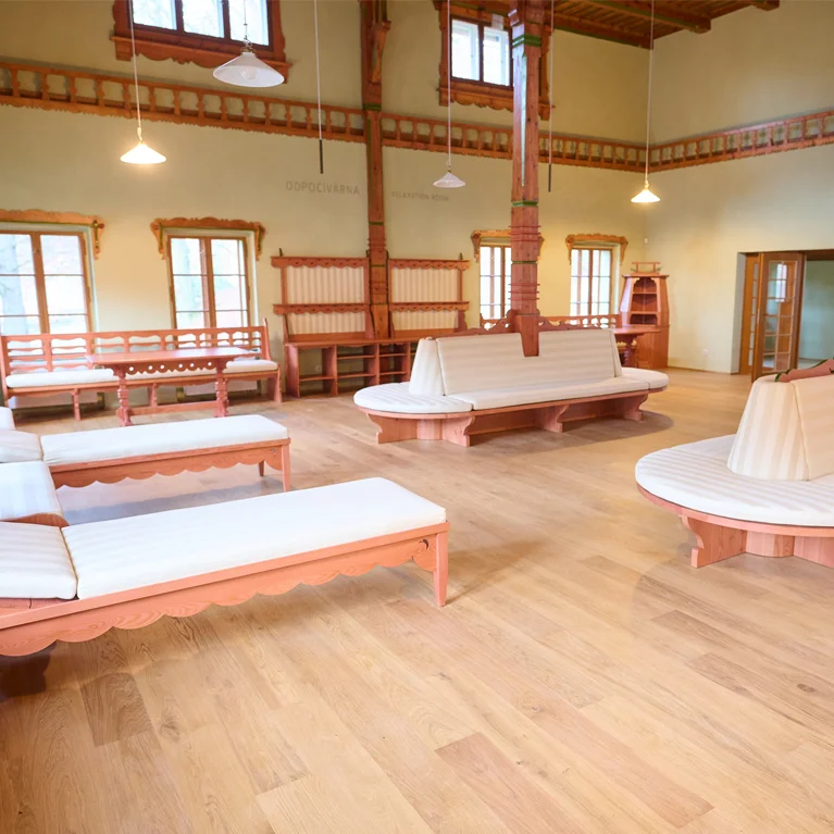 Unsere Ausstellung konzentriert sich auf die reiche Geschichte des Ortes, die Tradition der Wasserheilbehandlungen und die bedeutenden Persönlichkeiten, die zur Gestaltung dieses Ortes beigetragen haben. Mittelpunkt unserer Hauptführungsroute ist das majestätisch restaurierte Ruhezimmer des Architekten Dušan Jurkovič, ausgestattet mit Repliken des ursprünglichen Mobiliars aus dem Jahr 1902.