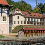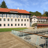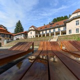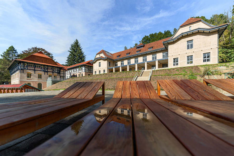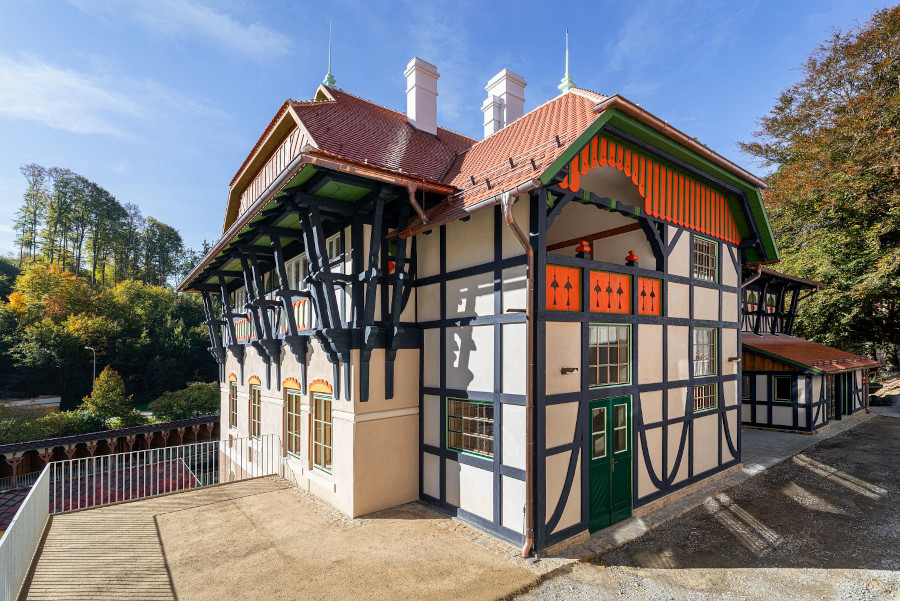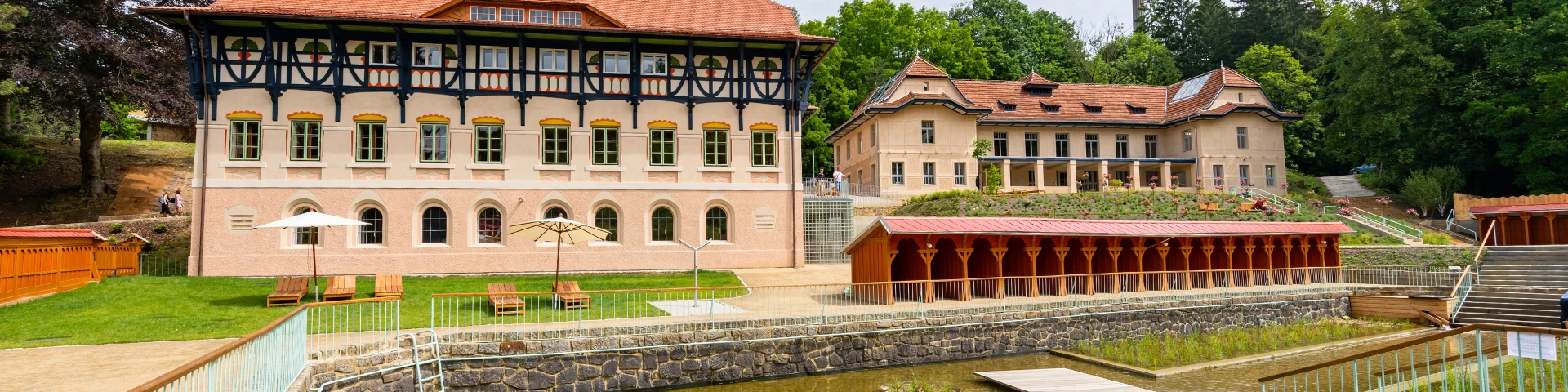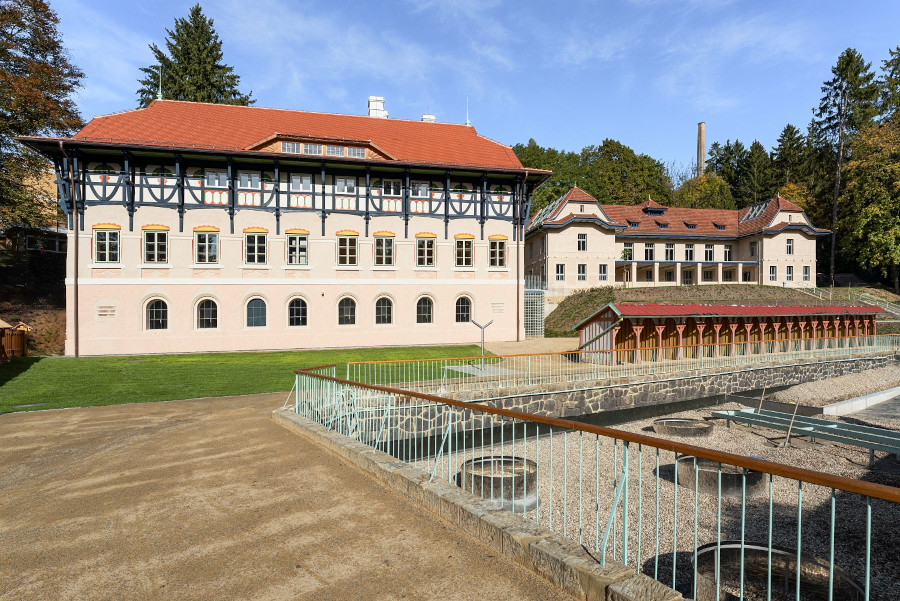 Wir laden Sie ein, einen Komplex zu erkunden, der überwiegend in den Jahren 1901 bis 1910 entstanden ist. Alles begann mit Jurkovičs Umbau der Jestřabí-Mühle aus dem frühen 18. Jahrhundert. Der Architekt nutzte das ursprüngliche Mauerwerk für das neu entstehende Wasserheilinstitut. Nach und nach wurden weitere Gebäude errichtet, die für Wasserheil-, Moor- und Schwefelbehandlungen mehr als hundert Jahre lang genutzt wurden. Im Laufe der Zeit übernahmen modernere Kuranlagen deren Rolle, insbesondere der benachbarte Rehabilitationspavillon, der heute als Zentralbad bekannt ist. Im Jahr 2012 wurde der Komplex vollständig geschlossen; lediglich ein Teil der Fluss- und Sonnenbäder stand noch zum sommerlichen Sonnenbaden zur Verfügung.